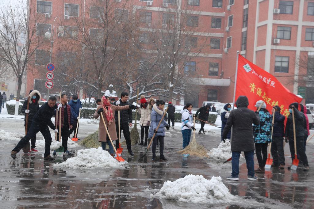 1月4日中午1点钟刚过,资源与环境学院四十余名资环师生放弃午休,全身心投入到扫雪活动中,忘却了湿透的鞋子和冻红的双手,经过近2个小时的清扫,学校西大门广场上的积雪被全部清除干净,有效保障了全校师生的出行安全。