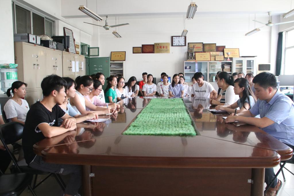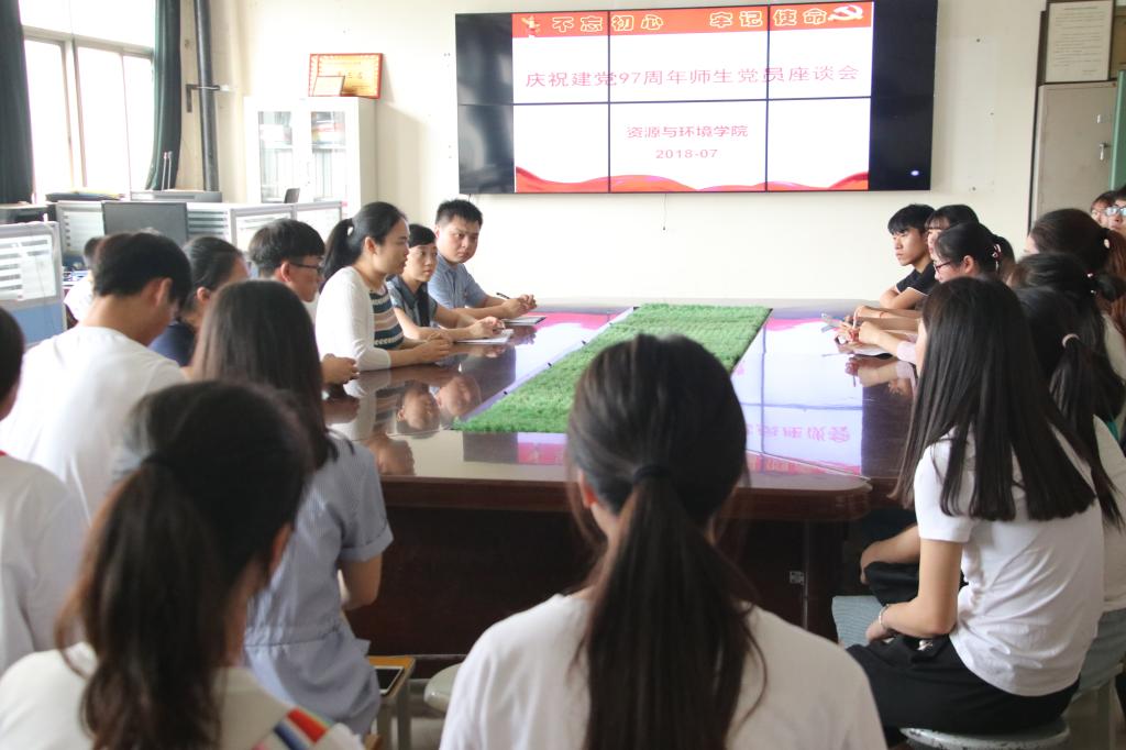 为深入学习党的十九大精神,贯彻落实习近平总书记在北京大学师生座谈会上的讲话,充分发挥优秀党员的模范带头作用,资源与环境学院于2018年7月6日下午五点在E305召开庆祝建党九十七周年“不忘初心、牢记使命”师生座谈会。出席本次会议的有资环学院党委书记高扬帆、团委书记叶晖、团委辅导员姜丽娟、团委辅导员侯超逸以及50余名学生党员。