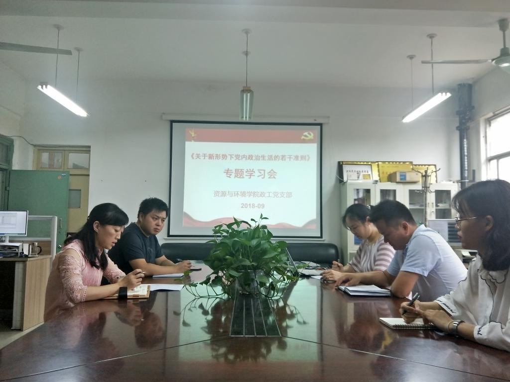 9月6日上午,资环学院政工党支部进行了《关于新形势下党内政治生活的若干准则》专题学习。