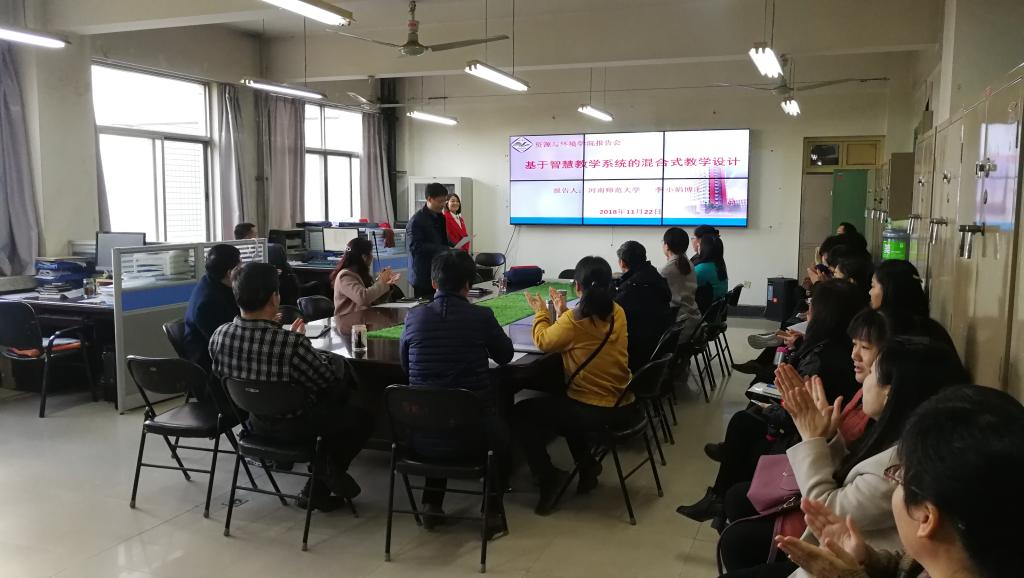 邀请河南师范大学李小娟博士在实验楼E307做了关于“基于智慧教学系统的混合式教学设计”的专题报告。资源与环境学院党政领导及全院教师参加了报告会。报告会由王洪亮院长主持。