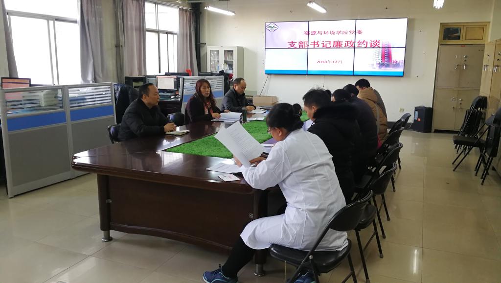 为贯彻落实全面从严治党要求,强化纪律观念,树牢宗旨意识,12月13日,资源与环境学院党委书记高扬帆在实验楼E307会议室对全院教工党支部书记进行了集中廉政约谈。