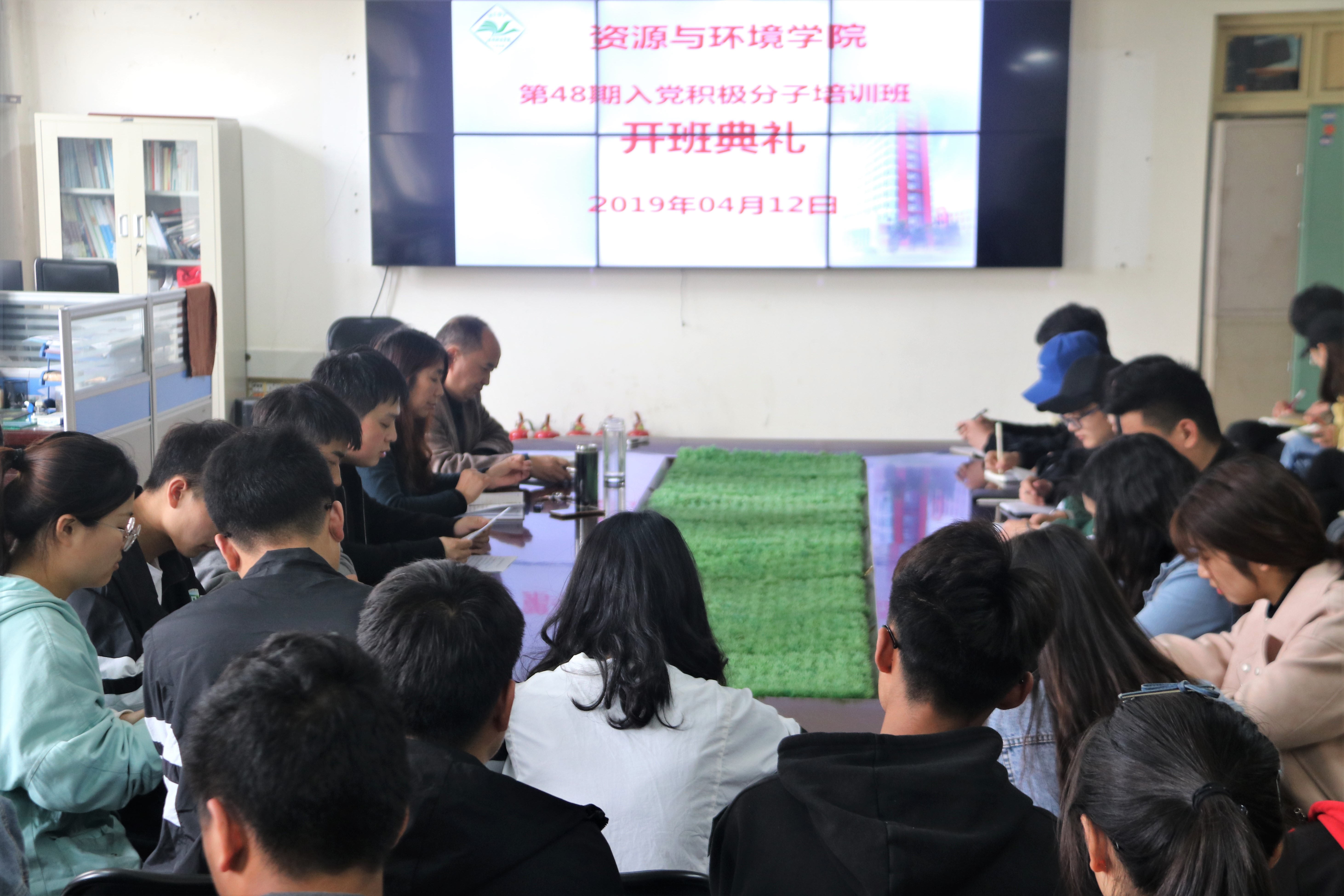 4月12日中午,资源与环境学院在实验楼E307会议室举行第四十八期党的基本知识培训班开班典礼。学院党委书记高扬帆、党委副书记刘军锋、团委辅导员侯超逸及60名入党积极分子参加了开班典礼。