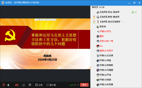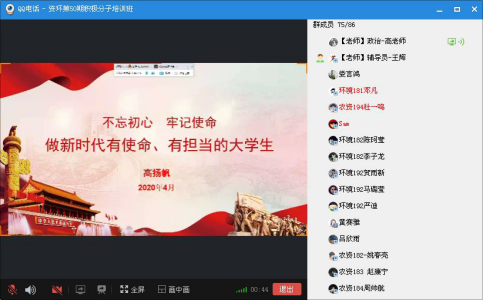 为全面提升入党积极分子的理论素养,进一步坚定理想信念,提高党员发展质量,资源与环境学院于2020年4月25日上午9:00在QQ直播平台进行了第50期党课线上课程。学院党委书记高扬帆以“不忘初心、牢记使命,做新时代有使命、有担当的大学生”为主题开展了主题党课。