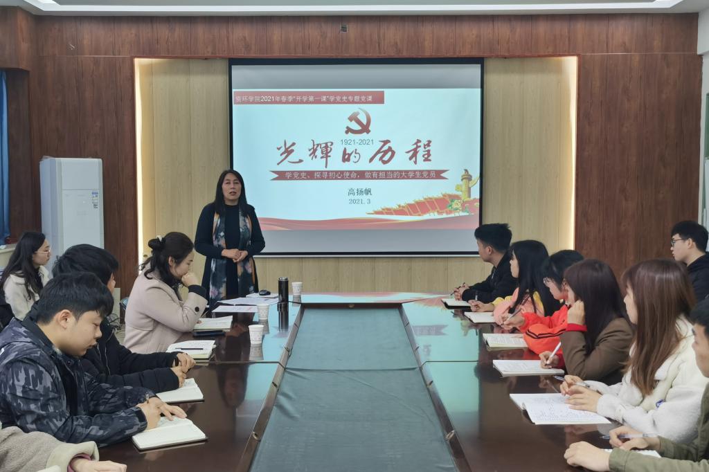 动员大会结束后,高扬帆以“学党史、探寻初心使命,做有担当的大学生党员”为题,从“党史学习意义及发展脉络”、“新民主主义革命时期”、“社会主义革命和建设时期”、“改革开放和社会主义现代化建设时期”与“做有理想有担当的大学生党员”五个方面讲解了我党从1921年到2021年的光辉历程。她指出,学生党员干部要以身作则,积极投身党史学习教育中,并且带动全体学生共同参与到党史学习教育的活动中。
