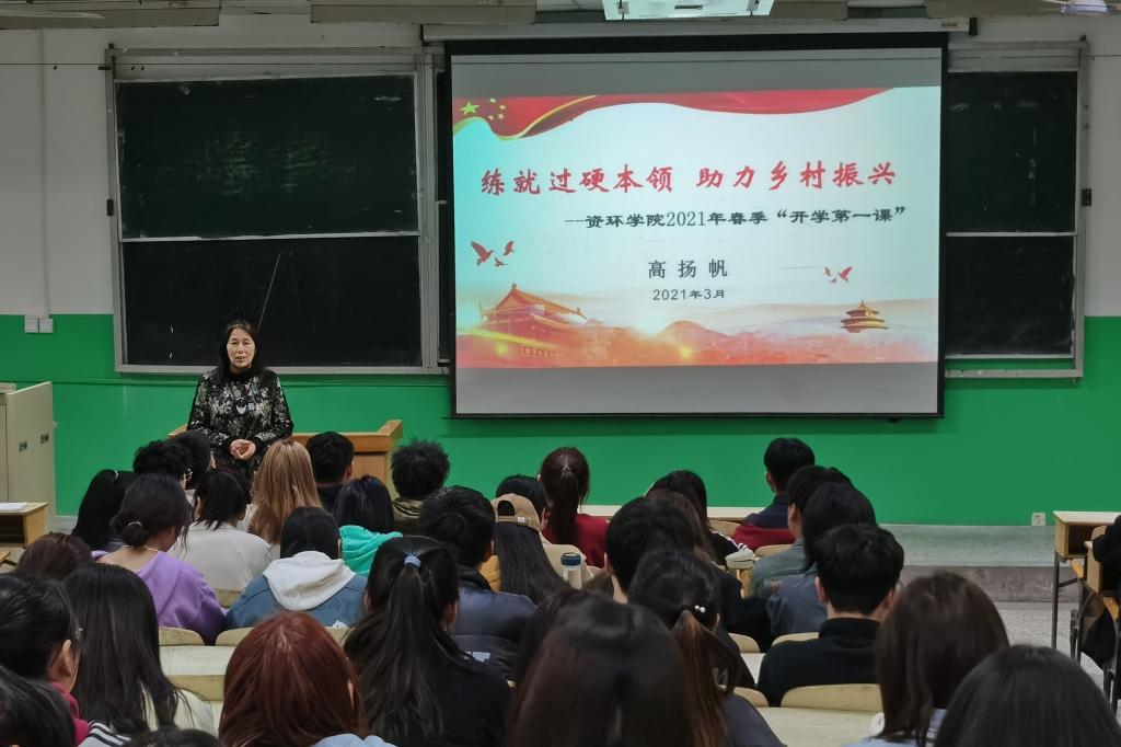 3月22日晚,资源与环境学院党委书记高扬帆在二合一教室为2019级、2020级学生讲授2021年新学期开学第一课。