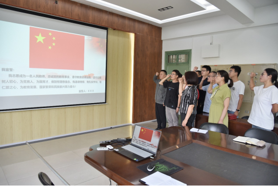 会议开始前,新入职的教师在高扬帆的带领下,进行了庄严的教师入职宣誓,掷地有声的誓词,紧握高举的右拳,是每一位新教师的自我期许,更是对教育事业的庄严承诺。
