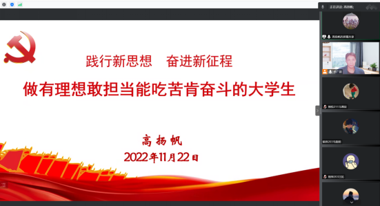 为深入学习宣传贯彻党的二十大精神,11月22日,资源与环境学院党委书记高扬帆为学院学生第五党支部、植保201班和植保203班全体同学作了党的二十大精神辅导报告。会议以线上形式进行,学院学生第五党支部书记李广领主持报告会。