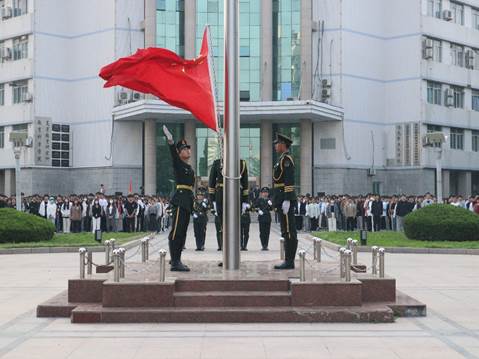 上午7时,在国旗护卫队的护送下,五星红旗在国旗台前冉冉升起,全体师生面向国旗奏唱国歌,行注目礼。