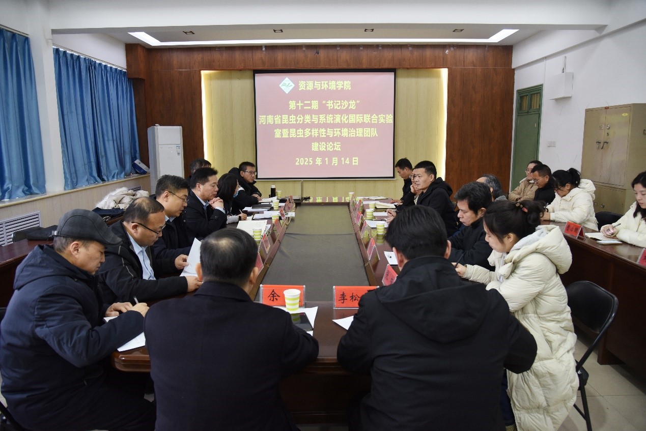 1月14日下午,在实验楼E307会议室,资源与环境学院成功举办第十二期“书记沙龙”——河南省昆虫分类与系统演化国际联合实验室暨昆虫多样性及环境治理论坛。副校长丁轲、国际交流与合作处处长冯霞、实验室和设备管理处处长李勇超、科技处副处长王斌、余昊出席活动。资源与环境学院领导班子成员王鲁伟、刘润强、刘军锋、孔凡彬、李松伟及昆虫多样性及环境治理科研团队成员共二十余人积极参与活动。本次论坛由院长刘润强主持。