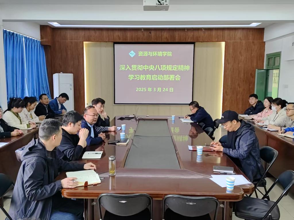 3月24日,资源与环境学院在实验楼E307会议室召开深入贯彻中央八项规定精神学习教育启动部署会,学院党政领导班子及全体科级干部参加了会议。会议由院党委书记王鲁伟主持。