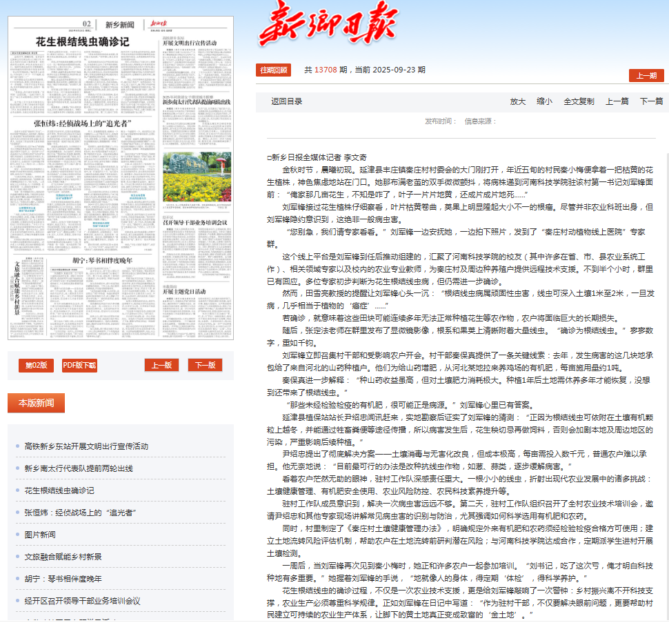 9月23日,《新乡日报》第二版显著位置刊发我校在延津县丰庄镇秦庄村驻村工作有关的独家采访文章--《花生根结线虫确诊记》。该文详细介绍了我校驻延津县丰庄镇秦庄村工作队,根据群众需求,结合我校科研及技术优势,为当地百姓解决生产中的疑难问题的事迹。