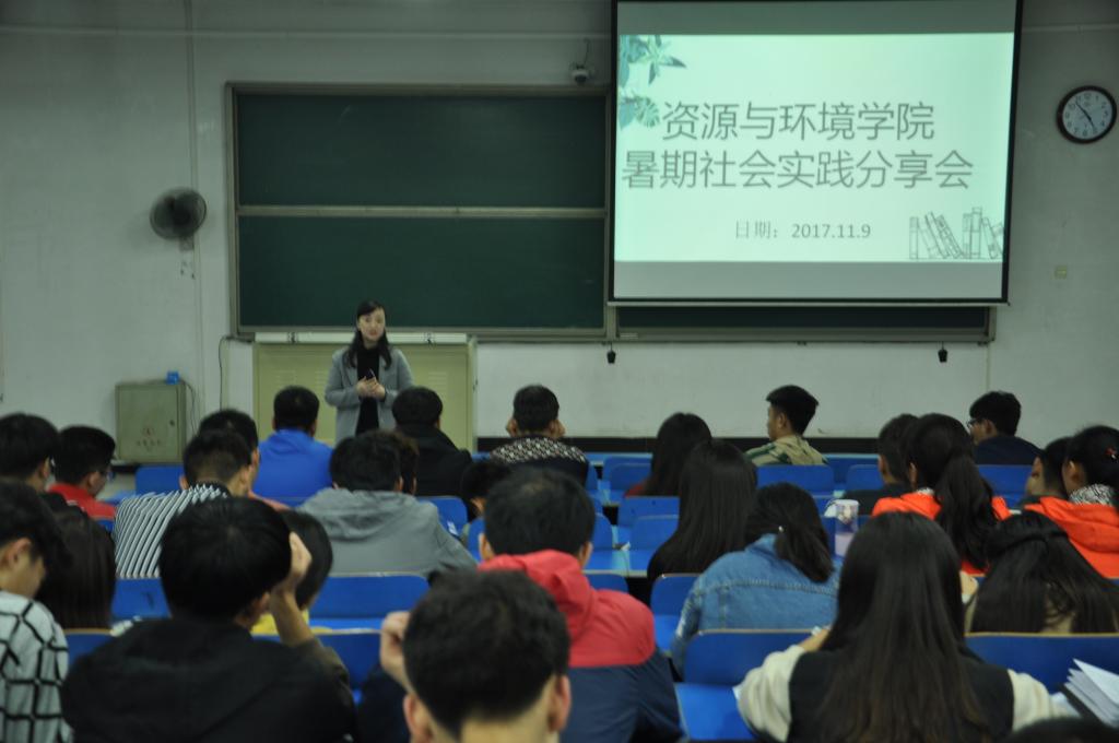 为促进当代大学生全面发展,培养创新型人才,让大学生开阔视野、分享暑假实践活动心得、增长才干。资源与环境学院于2017年11月9日下午2点50在五合四教室开展暑期实践活动分享会,参加本次分享会的有团委书记叶晖老师、学生会主席李想、各暑期实践活动团队负责人以及前来观看200余名17级学生。