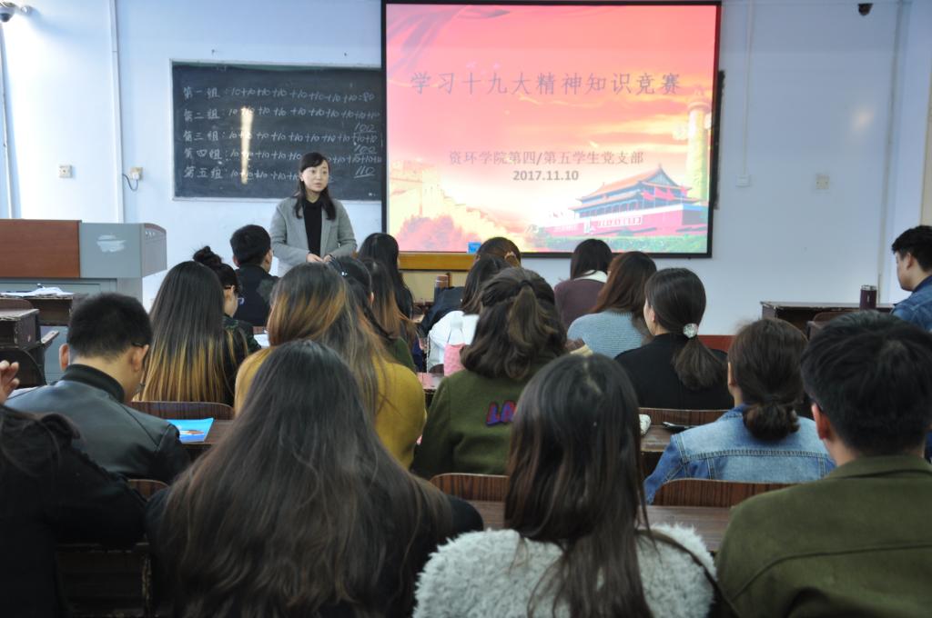 为贯彻和落实党的十九大精神,帮助在校大学生了解党的基本知识,引导青年大学生树立正确的世界观、人生观和价值观,积极践行社会主义核心价值。环境学院学生第四、第五党支部于2017年11月10日下午2:30在1202教室开展了学习十九大精神知识竞赛活动,参加此次竞赛的有团委书记叶晖和第四第五党支部党员及预备党员。