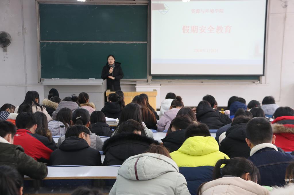 为了提高同学们的安全意识,确保寒假期间同学们的人身和财产安全,资源与环境学院于2018年1月8日于九合一举行17级同学假期安全大会。17级辅导员辅导员姜丽娟老师主持本次会议。