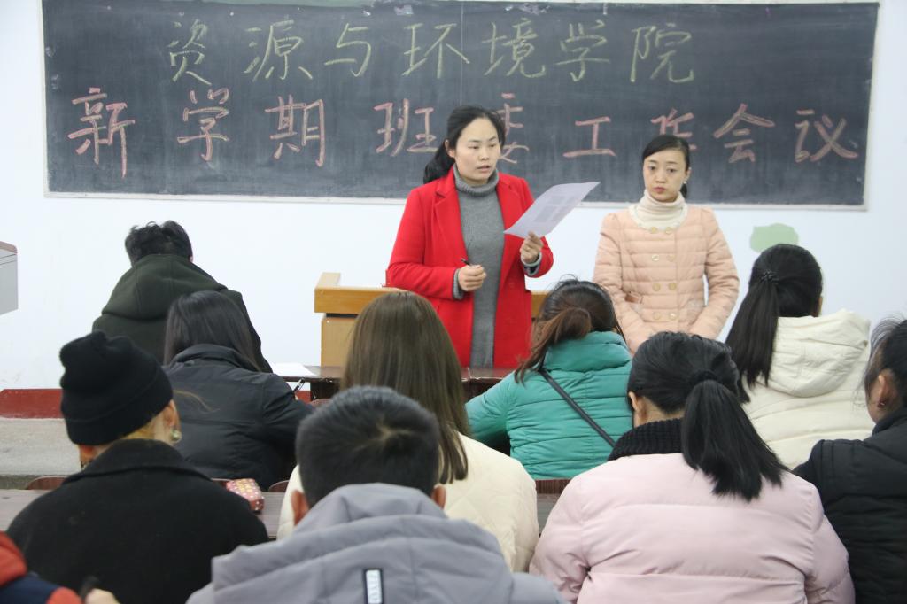 为了在新的学期更好地开展班级工作,进一步加强学风建设。资源与环境学院于2018年3月4日上午10点在1205教室展开新学期班委工作会议,参加本次会议的有团委书记叶晖老师,团委副书记李新安老师,团委辅导员姜丽娟老师、侯超逸老师以及15、16、17级各班班委代表。