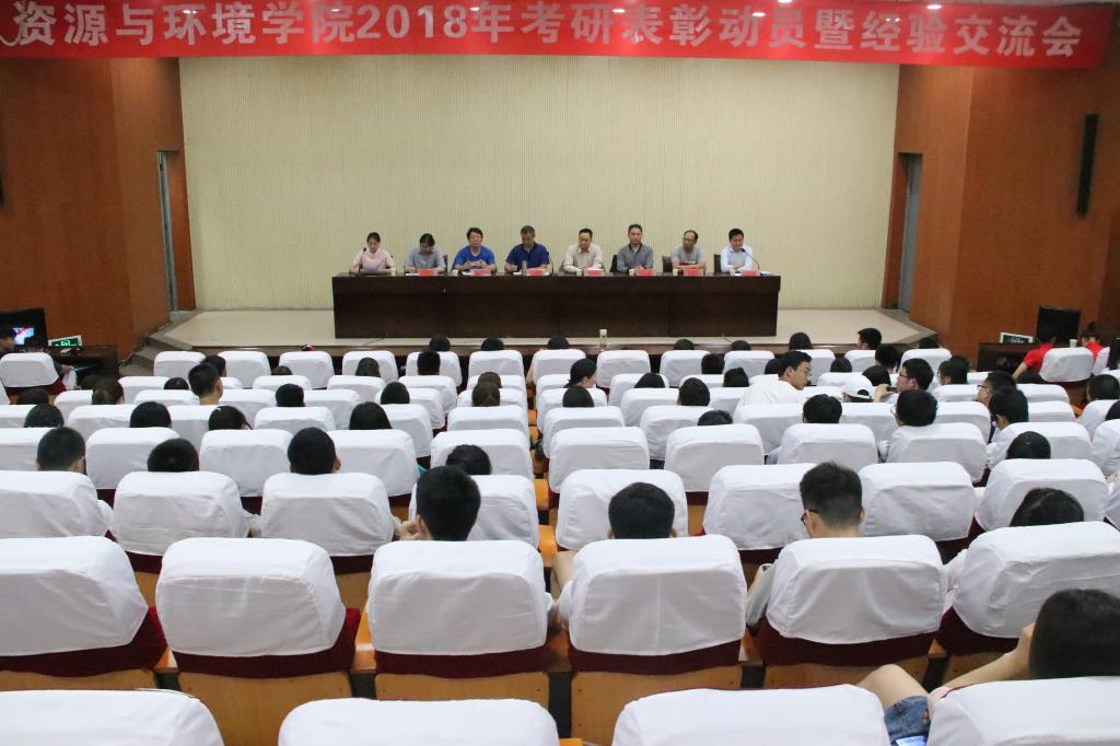 为激励和引导广大学生勤奋学习,全面发展,并使同学们对考研有更深入的了解,培养学生的学习积极性。资源与环境学院于2018年5月25日下午3:30在图书馆一楼报告厅举行资源与环境学院2018年考研表彰动员暨经验交流会,出席本次大会的有资源与环境学院院长陈锡岭、副院长吴大付、团委副书记李新安、环境科学系主任谢国红、植物保护系主任余昊、环境科学系副主任李东方、植物保护系田雪亮以及15级准备考研学生。