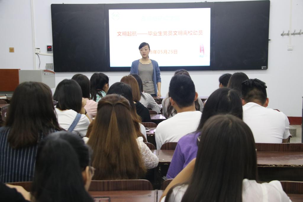 为确保2018届毕业生安全、有序、文明离校,切实维护学校的和谐、稳定。资源与环境学院特于2018年5月25日上午9:40在一号教学楼1108教室召开毕业生主题教育动员会,全力做好毕业生文明离校工作。出席本次会议的有团委书记叶晖、团委辅导员姜丽娟以及14级全体毕业生党员。