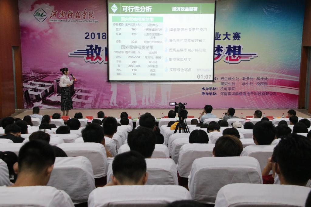为进一步深化我校创新创业教育,培养广大青年学生的创新意识、创造精神和创业能力,并为他们提供一个交流指导平台,91偷拍 于2018年6月5日下午三点在图书馆一楼报告厅举行了2018年“富鸿鼎杯”大学生创业大赛,出席本次大赛的有教务处处长郭运瑞、招生就业处处长何二毛、研究生处副处长徐兆栋、学生处副处长马新岭、校团委副书记于江傲、园艺园林学院党委书记冀红举、机电学院党委书记余鹏、信息工程学院党委副书记刘克平,担任本次大赛评委的是慧科教育集团副总裁、河南分公司总经理王川、河南智游臻龙教育科技有限公司副总经理许刚、洛阳国家大学科技园发展有限公司运营总监马军林、新乡863科技孵化器有限公司园区总经理田宇生、新乡市昂尼斯特仪器设备有限公司CEO新乡市智慧城市科技有限公司CEO刘俊森。参加本次创新大赛为各个院系的优秀项目团队,资源与环境学院有两支参赛队进入本次创业大赛决赛。