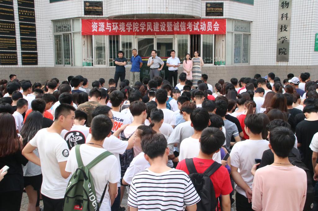 为促使2017-2018学年第二学期期末考试工作顺利进行,提高学生对期末考试的重视程度,增强资环学院学生学习意识,严肃学院考风考纪,资源与环境学院于2018年6月21日下午5:00在天井举行资源与环境学院学风建设暨诚信考试动员会。参加此次大会的有资源与环境学院院长陈锡岭、副院长吴大付、团委书记叶晖、团委副书记李新安、团委辅导员姜丽娟、团委辅导员侯超逸和15、16、17级400余名学生。