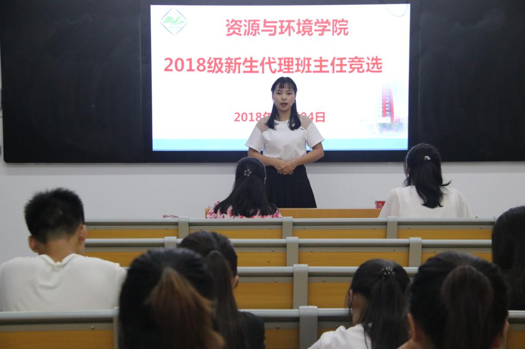 为更好的迎接18级新生的到来,帮助他们更好更快地了解学院专业、融入校园生活,2018年9月4日下午7:30,资源与环境学院在一号教学楼1211教室,举办了“2018级新生代理班主任竞选”活动。此次竞选活动面向所有16、17级学子,只要饱含热情、态度端正、成绩优秀、能为新生耐心服务,均可以积极踊跃报名参加。参加此次活动的老师有团委书记叶晖、团委辅导员姜丽娟,以及近50名参与竞选的学生。