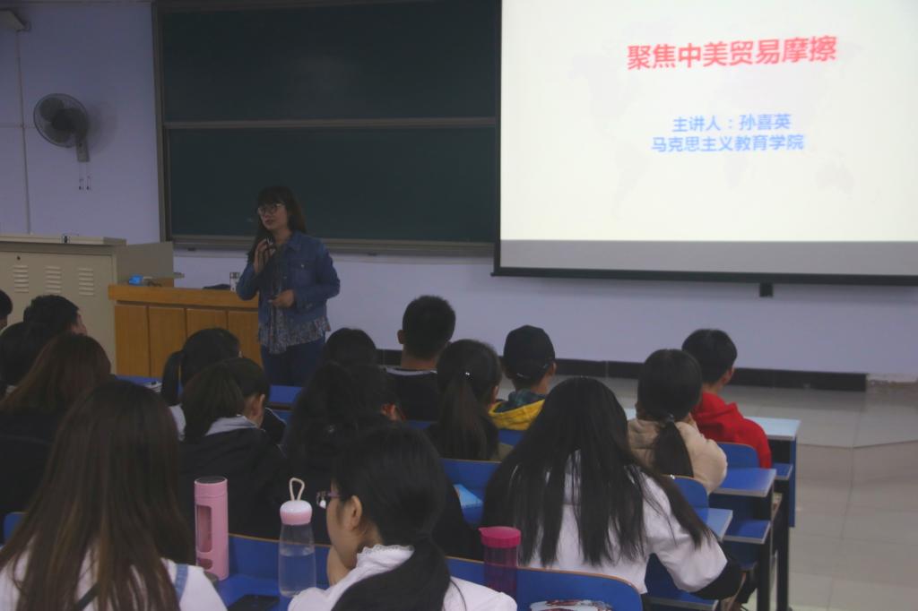 报告会上,孙喜英老师就当前国际形势对中、美等国家发展的影响展开讨论,详细的分析了中美贸易摩擦的起因,并指出这次贸易摩擦未来可能的发展方向。孙老师指出今天的中国已经不是国土沦丧、家破人亡的民族危亡状态,而是处在快速崛起的现代化进程中,目前最大的危机不是贸易摩擦,而是世界上最大的霸权国家公开把中国当成最主要的对手,覆巢之下安有完卵,孙老师强调大家应树立国家利益重于一切的观念。
