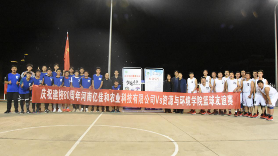 为庆祝建校80周年,促进校友之间交流,10月29日晚,河南亿佳和农业科技有限公司篮球队在校友李永铭带领下,到校和资源与环境学院篮球队举行校友篮球友谊赛。资源与环境学院党委书记高扬帆、院长王洪亮、学生处副处长郭超杰、陈利、院党委副书记刘军锋及100余名师生到场观看了比赛。