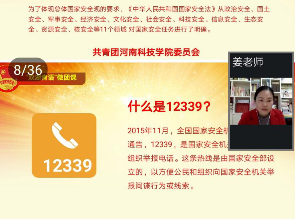 组织开展“全民国家安全教育日”主题微团课活动。资源与环境学院团委书记姜丽娟老师围绕“全民国家安全教育日”通过线上直播的方式开展主题团课,各团支部积极响应,支部书记带领支部同学积极学习相关内容,分享交流学习心得。