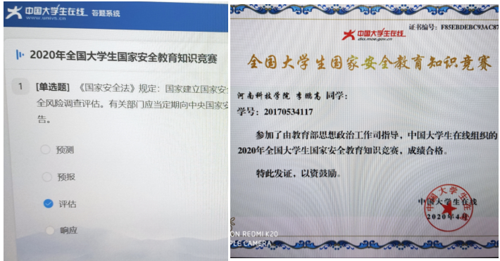 组织参加2020年“全国大学生国家安全教育知识竞赛”。组织学生积极参与2020年“全国大学生国家安全教育知识竞赛”,通过竞赛使学生掌握国家安全相关知识,树立国家安全意识,主动宣传国家安全知识,自觉关心、维护国家安全。