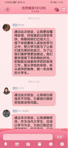 各班心理委员通过QQ课堂,腾讯会议等形式线上召开主题班会。为达到更好的心理健康教育效果,班级同时在课后线下开展相关主题班会活动。班会分别进行了线上合唱、有问必答、观看心理健康视频、微电影、个人演讲、诗歌朗诵、心理小游戏等活动,过程中同学们围绕“积极调整心态,融入校园生活”的主题召开本次活动, 主动分享疫情期间防疫措施和个人心灵感悟,向同学们传授生活经验,提出调整心理健康的正确方法。活动结束之际,心理委员总结发言,希望通过此次班会让同学们加强沟通交流,在一定程度上提高同学在疫情期间的心理健康知识水平,增强心理保健意识,注重心理健康。