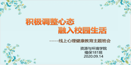 为提高学生返校复学适应能力,及时了解同学心理和生活动态,加强疫后心理健康辅导,促进同学之间心与心的交流,9月4日-15日,资源与环境学院召开心理健康教育主题班会,班会由各班心理委员主持、全员参加,采用线上和线下结合的方式进行。