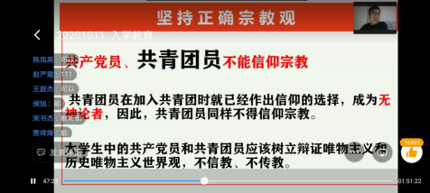 理想信念教育与民族宗教理论知识教育。10月11日,资源与环境学院线上开展理想信念教育与民族宗教理论知识教育,让学生了解宗教产生的本质、原因,及我国关于宗教的法律法规,引导学生树立正确的民族观、宗教观。通过对习近平新时代中国特色社会主义思想的深入学习,牢固树立“四个意识”,坚定“四 个自信”,做到“两个维护”。