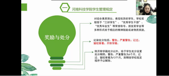 资助政策与诚信感恩教育、安全教育。10月16日晚,资源与环境学院20级辅导员王辉通过线上方式开展资助政策与诚信感恩教育、新生安全教育。王辉老师从宿舍安全、财产安全、人身安全等方面进行了详细的讲解,嘱咐学生们要擦亮眼睛,保障自己的人身及财产安全。同时他对高校资助政策进行了详细的讲解,勉励同学们要讲诚信,懂感恩,有规划、有目标的完成大学学业。