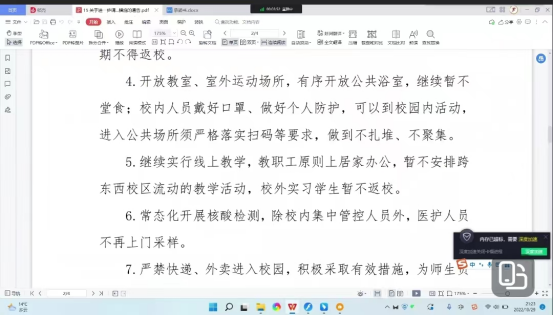鉴于当前学校周边形势依然复杂,为确保校园正常秩序,学校继续加强闭环管理。全院学生要遵守“非必要不外出”的原则,确需离校者应严格执行请假流程,并在返校后根据要求做好健康监测;在校园内要做好个人防护,不聚集不扎堆,进入公共场所出示场所码,暂不堂食;在宿舍做好线上课程安排,保证学习效率;按学校要求及时参加全员核酸检测,暂不点外卖、不网购。全体师生要振奋精神,鼓足干劲,一起守护来之不易的疫情防控成果,共同维护校园安全稳定。