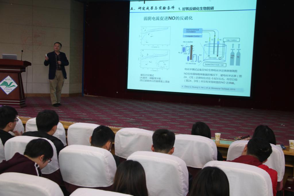 报告会由资源与环境学院吴大付副院长主持。报告会上,黄老师讲解了生物过滤反硝化脱硝关键科学问题的研究,包括氮氧化物的危害、氮素的循环过程及循环途径、好氧反硝化在烟气脱硝领域的应用研究并举例介绍了工业烟气生物过滤脱硝系统,使学生们更全面、更深入的了解生物过滤脱硝的原理技术及应用。报告会后,参会老师与同学们积极发言,向专家请教自选报告会内容中的困惑,黄老师进行了详细的回答并分享了自己在实际工程中的实践经验,另学生们向黄老师询问了关于考研方面的问题,黄老师用幽默生动的回答解决了学生们的疑问。报告会使与会师生增长了专业知识,开拓了视野,激发了大家的学习和科研的兴趣,增强了学生考研的信心。