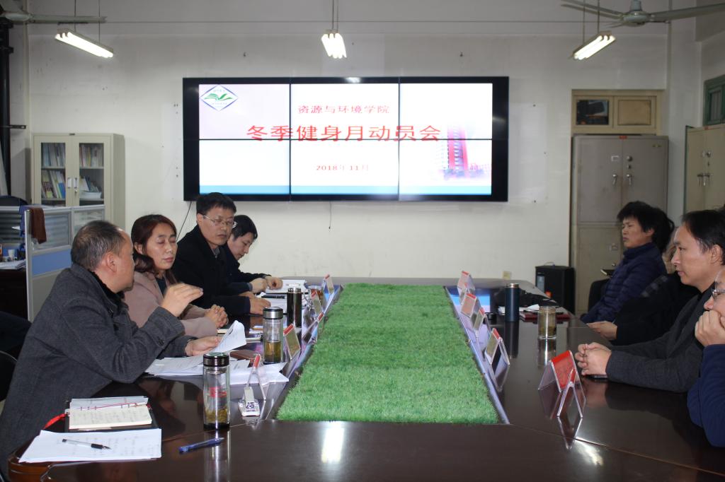 为进一步增强资源与环境学院教职工的健身意识和身体素质,营造“健康、快乐、高效”的工作氛围,缓解工作疲劳,提升工作效能,资源与环境学院工会积极行动,于11月29日下午召开动员会,按照校工会《关于开展2018年教职工“冬季健身月”活动的通知》要求,号召广大教职工广泛开展健身运动。