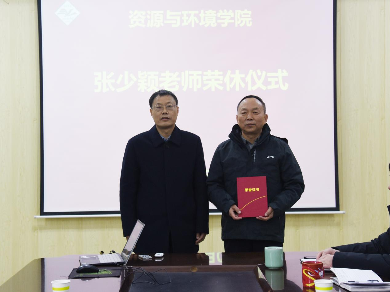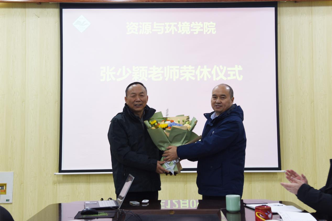 仪式伊始,校科技处处长兼资源与环境学院院长刘润强宣读了学校《关于张少颖老师荣休的通知》,副校长王洪亮为张少颖颁发荣休证书,院党委副书记兼分工会主席刘军锋代表全体教师为张少颖献花。