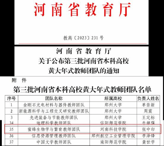 日前,河南省教育厅公布了第三批“河南省本科高校黄大年式教师团队”认定结果,资源与环境学院张中印教授负责的蜜蜂生物学与繁育教师团队入选。