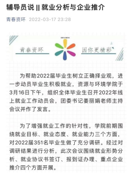 “辅导员说”以“说”的形式,将学生成长过程中的重要内容、重要节点贯穿起来,实现思想引领与行动引领相结合、育人和助人相结合的目。为了提升“辅导员说”思政工作项目的育人实效,资环学院团委在广泛开展论证、征求师生意见的基础上,确立了“辅导员说”项目的主要内容和主要形式。