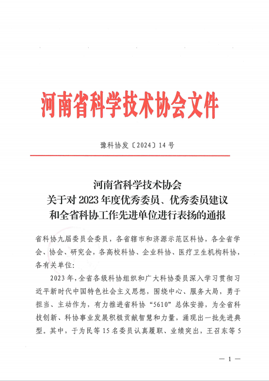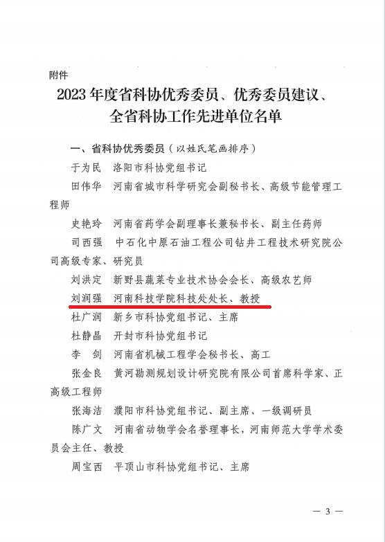 近日,河南省科学技术协会印发了《河南省科学技术协会关于对2023年度优秀委员、优秀委员建议和全省科协工作先进单位进行表扬的通告》(豫科协发[2024]14号),91偷拍 刘润强教授被评为2023年度省科协优秀委员。