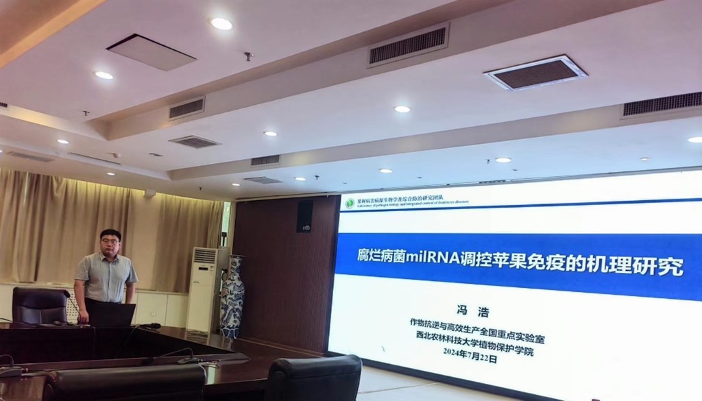 冯浩教授首先介绍了苹果产业对农业经济增长的贡献。随后,指出苹果腐烂病是影响苹果产业健康发展的最大障碍。通过明确该病菌的传播规律和入侵途径,找准了防病时期和部位,创建了“压菌源、阻入侵、抗扩展”的高效综合防控技术体系。冯浩教授进一步阐述了milRNA在植物与病原真菌互作中发挥的功能,并基于Vm-milR1介导的跨界调控,挖掘到苹果多个免疫调控因子,为利用转基因、基因编辑等技术创制抗腐烂病材料提供了重要的基因资源。