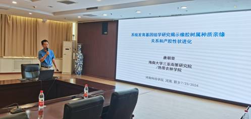 唐朝荣以“系统发育基因组学研究揭示橡胶树属种质亲缘关系和产胶性状进化”为题,从我国橡胶产业发展现状和目前遇到的瓶颈讲起,介绍了橡胶树属种质亲缘关系和产胶性状进化的研究进展,成果以及未来的行业展望,引导学生对我国这一战略资源来认识和理解,激发青年学子立志献身热带高效农业发展,解决橡胶产业卡脖子问题,为国家橡胶产业战略安全提供支撑。