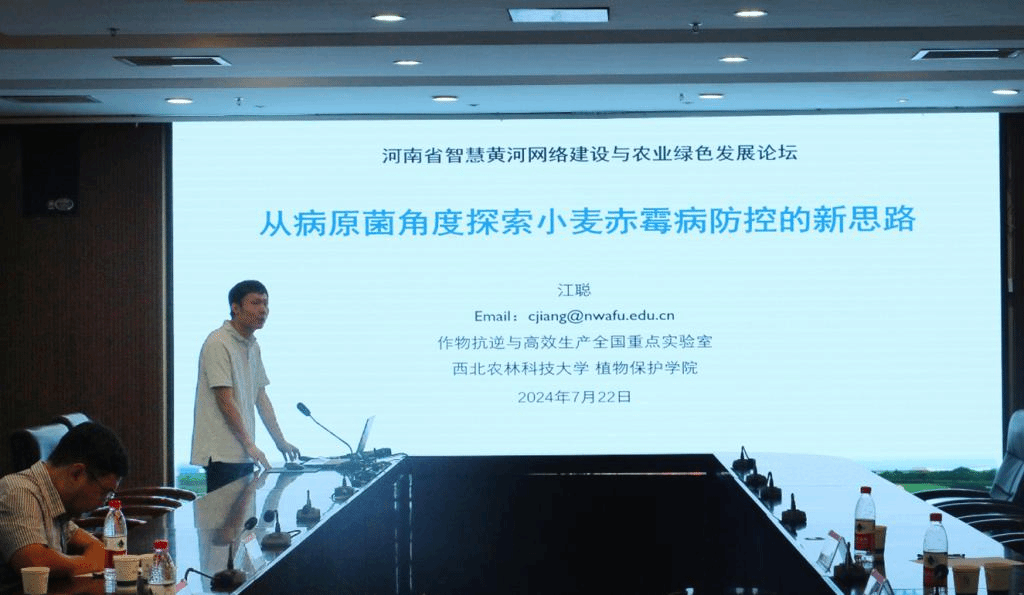 江聪教授以“从病原菌角度探索小麦赤霉病防控新思路”为题,围绕病原菌如何调控菌源形成、侵染发生、毒素合成以及如何影响小麦免疫调控等科学问题进行了深入的报告。江聪教授指出当前小麦赤霉病防控形势十分严峻,控制禾谷镰刀菌菌源形成,切断病原菌侵染途径是防控的关键。江聪教授课题组经过多年研究,发现Gial、GipI等新型非信息素依赖的G蛋白偶联受体在小麦赤霉病初侵染菌源子囊孢子形成中的重要作用。这一突破为开发基于受体干扰的菌源控制技术提供了理论依据,为赤霉病的防控开辟了新思路。此外,课题组还发现TRI10和TRI6通过异源二聚体形式调控禾谷镰刀菌DON毒素的合成,为破解DON毒素合成机制及研发DON毒素合成干扰技术提供了新思路。江聪教授还在报告中强调了病原菌与小麦之间复杂的互作关系,并指出深入理解这些机制对于制定有效的防控策略至关重要。