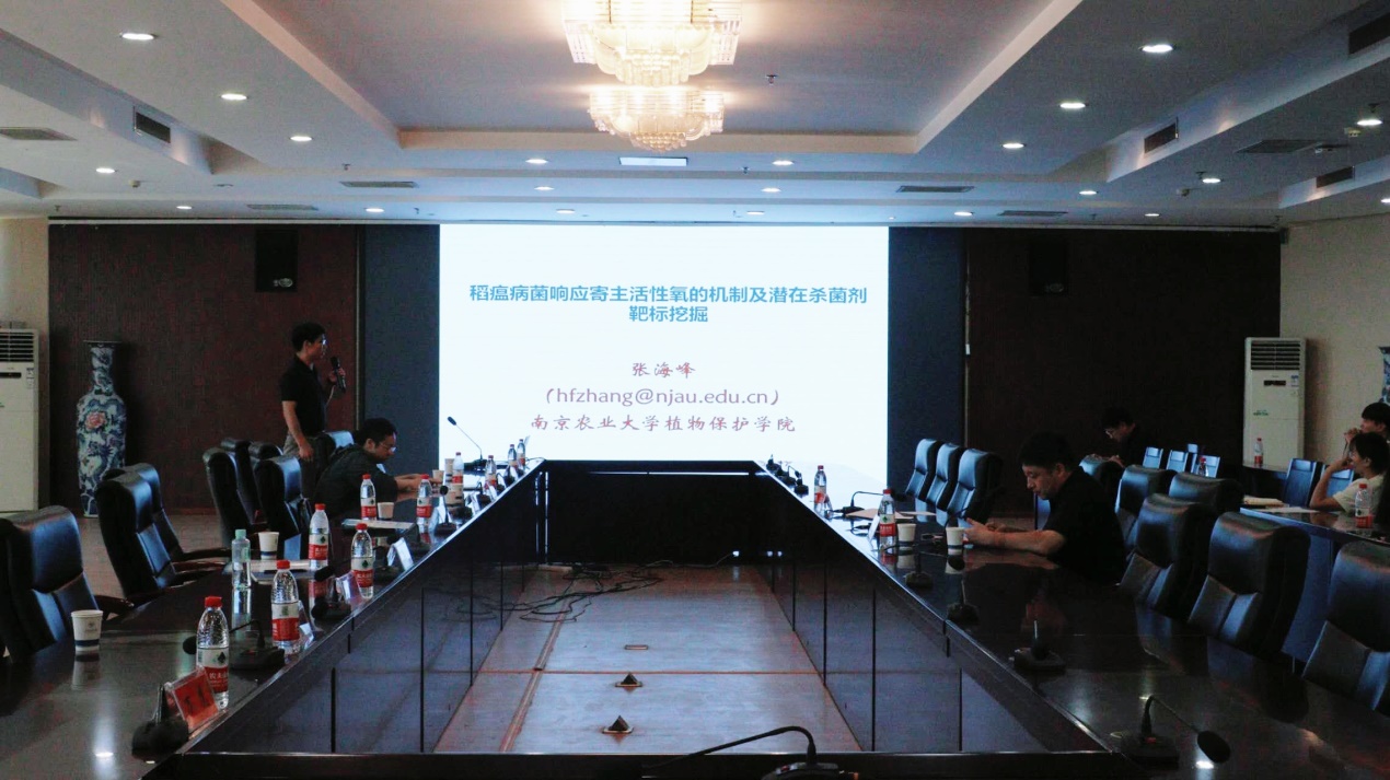 张海峰教授以“稻瘟病菌响应寄主活性氧的机制及潜在杀菌剂靶标挖掘”为题,介绍了稻瘟菌在侵染过程中诱导水稻ROS迸发的机制、MoPtp1/2调控MoOsm1的去磷酸化,并且参与抑制寄主的活性氧迸发的机理,为挖掘杀菌剂新型靶标奠定了理论基础,为稻瘟病的绿色防控提供了新思路。在报告交流环节,张海峰教授与参会人员就稻瘟菌与水稻互作机制、稻瘟病综合防控措施及安全施药等内容展开了热烈讨论,与会师生受益匪浅。