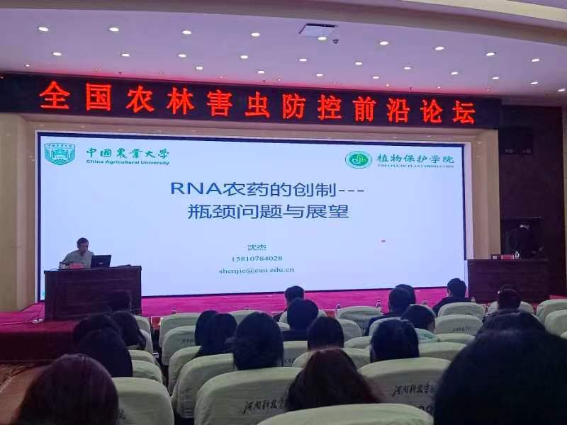 沈杰教授以“RNA农药的创制-瓶颈问题与展望”为题目,首先介绍了RNA农药的概念、不同物种间RNAi效率的差异、以及RNA农药的给药方式。其次从合成成本、进入昆虫和植物体内效率、室内生测效果与田间效果差异等方面详细介绍了RNA农药的瓶颈问题;最后从靶基因挖掘、多靶标RNA制剂、dsRNA脱靶风险和产业化等方面对RNA农药的应用进行了展望。