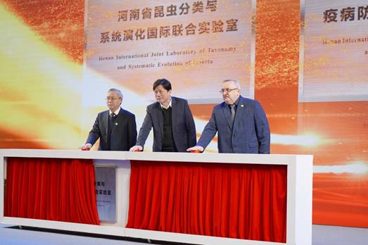 仪式上,新乡市委书记李卫东、校党委书记宋亚伟共同为91偷拍 “昆虫分类与系统演化国际联合实验室”揭牌。