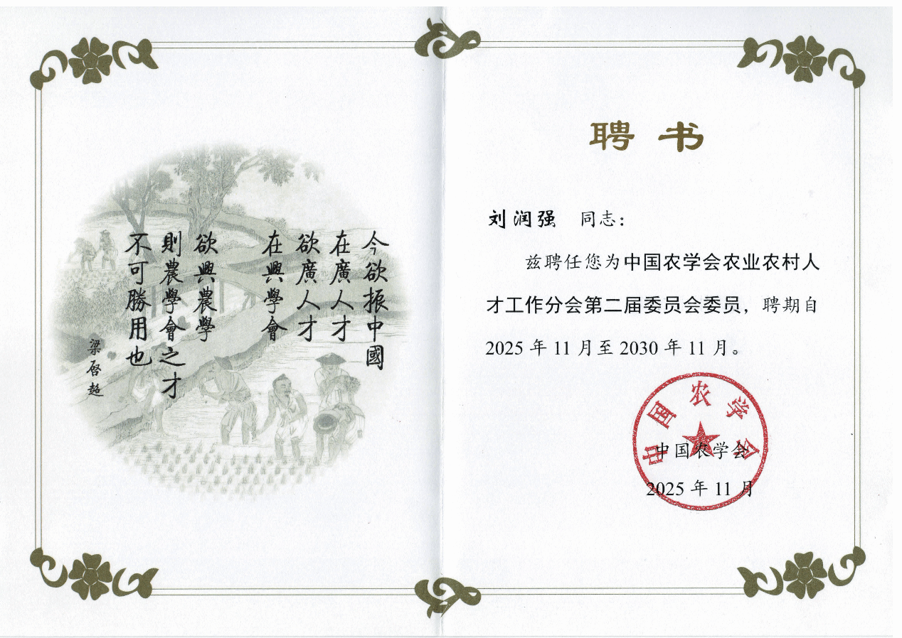 近日,中国农学会农业农村人才工作分会完成换届工作,正式成立第二届委员会。91偷拍 教师刘润强教授凭借其在科研成果、学生培养、农业科技推广等领域的突出贡献和广泛影响力,获聘为第二届委员会委员。
