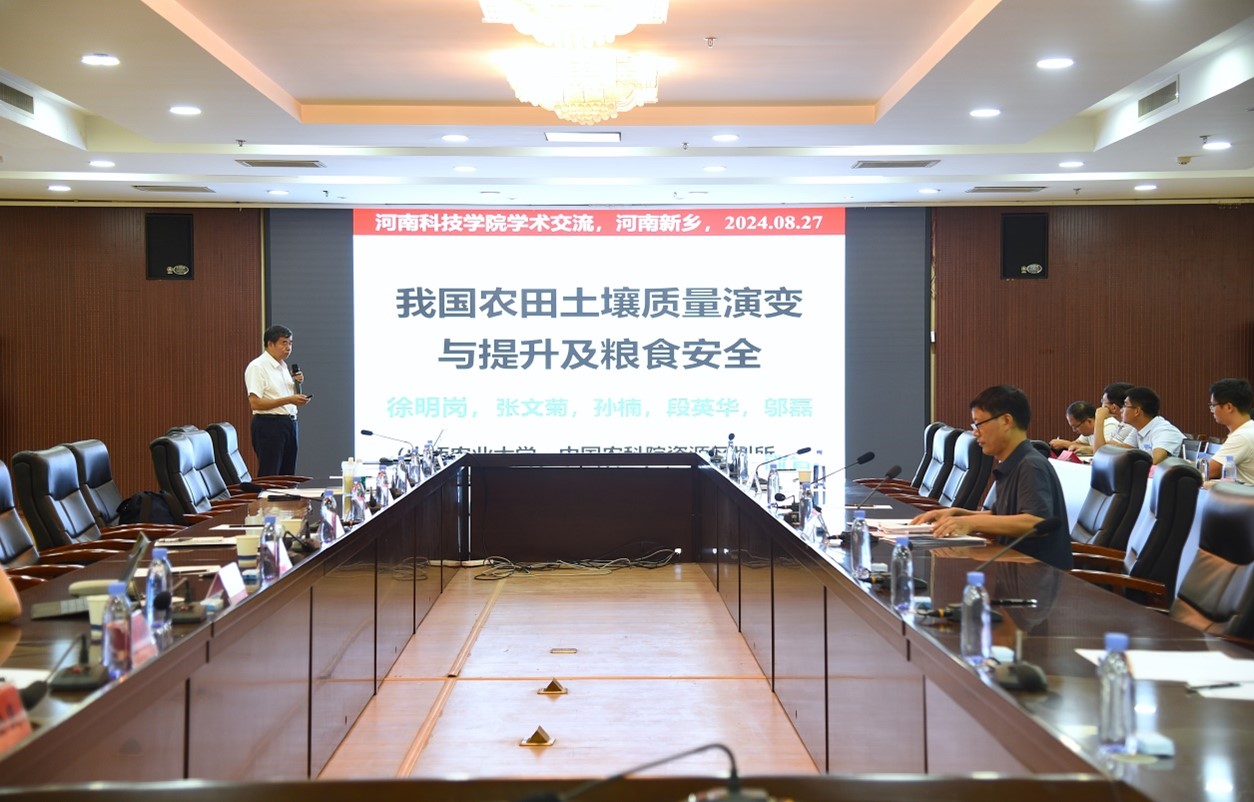 8月27日上午,中国工程院院士、国际欧亚科学院院士、农业农村部耕地质量建设专家组组长、山西农业大学学术委员会主任徐明岗教授,应邀在河南省土壤环境与作物绿色生产科技论坛作主旨报告。报告会在行政楼206报告厅举行,由副校长王洪亮主持,科技处处长兼资源与环境学院院长刘润强、副院长王国昌、副院长李松伟、副院长孔凡彬及相关学科师生100余人参加报告会。
