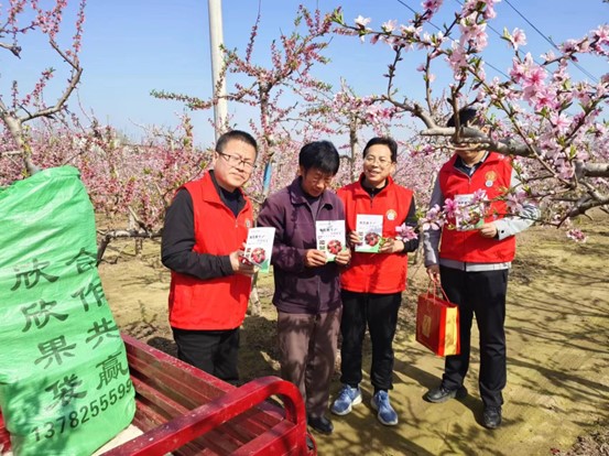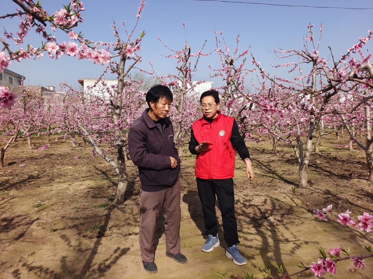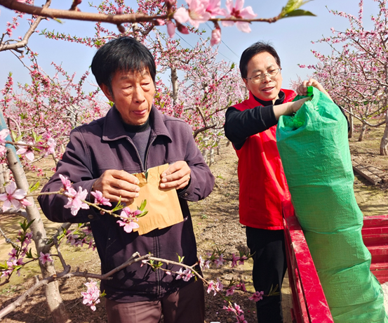 服务团向果农捐赠了《桃树栽培管理技术》科普图书和6万个果实套袋,牛习温对服务团的技术指导和捐赠物品表示了感谢,他说“2024年春季天气适宜,桃树盛开,在服务团的帮助下,黄桃一定能取得大丰收。”
