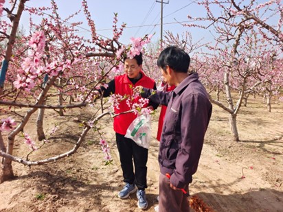服务团前往淇县西岗镇秦街村,深入田间指导复剪、疏花和病虫害防治技术。陆宁海博士详细介绍了早春桃园清园的技术要点,在春天土地解冻之前,一定要将桃园内所有的枯枝烂叶、杂草和病枝病果等全部清理出园地之外。同时,在桃树萌芽之前,选择无风晴朗的天气,对整个园区喷洒3-5波美度的石硫合剂,杀除越冬虫卵,以确保桃园的健康和美观。力争收到减少病虫危害、提高果品质量的良好效果。另外,春季也是防治桃树腐烂病的重要时期,可采用刮除腐烂病病斑、涂抹溃腐灵等方法进行防治,且及时带出刮除物深埋销毁。
