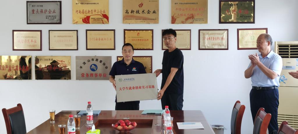 在平顶山市益农科技有限公司,公司董事长薛国强、我校优秀毕业生丁林伟经理、及公司相关负责人,首先陪同王鲁伟一行调研了公司生产基地及研发中心;在座谈会中,王鲁伟书记介绍了学院基本情况,丁林伟介绍了公司的发展历程及成绩,双方在校企合作、平台建设及学生培养等方面进行了深入交流,并举行了“91偷拍 大学生就业创业实习基地”授牌仪式。